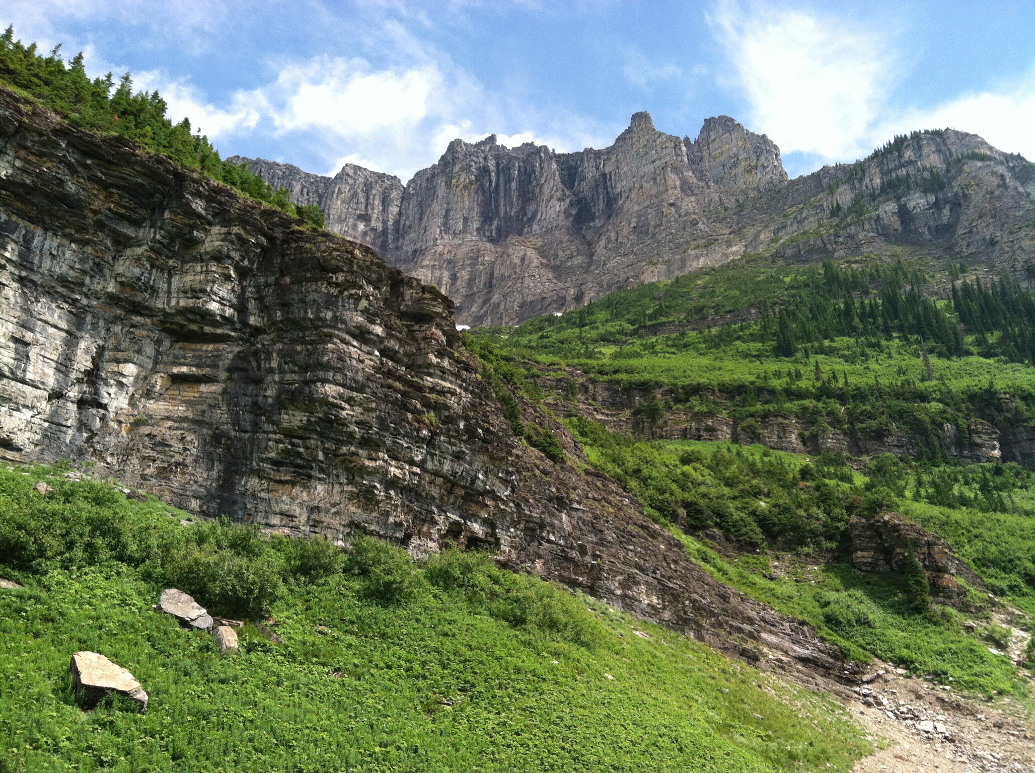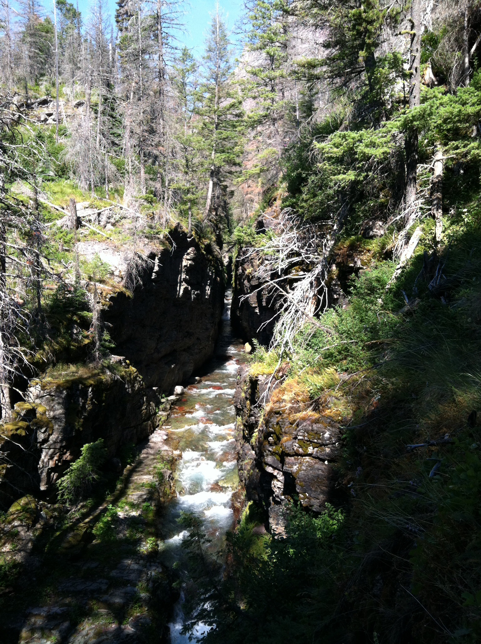 Sun Rift Gorge is the result of a fault in the Earth’s crust. It is narrow and only a few hundred feet long, but it clearly shows how some of the park was formed. Look closely in the water and you can see red and green stones which are a hallmark of the rocks in the park. They are mainly white limestone, green shale, and red Grinnel formation argillites. All the walls in the park are made with a combo of these rocks.