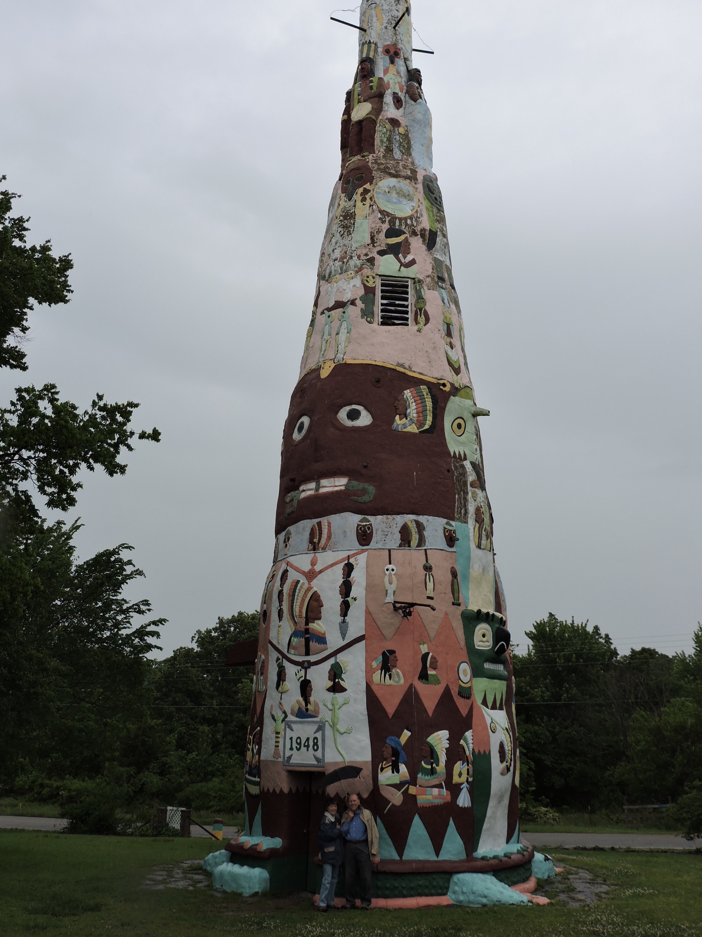 In Claremore we ran across the largest totem pole in the world. Linda and Earl ar standing in front of it and yes, it was raining again.